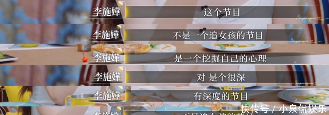 最新一期节目两对嘉宾去滑冰,车崇健在节目里第一次获得李施嬅的许可,牵着手一起滑。大家吃饭的时候,梁淞提起这一段,兴冲冲地问两个人什么感觉,有没有被电到?李施嬅清醒地指出,这不是一个追女孩儿的节目,而是探索自我,发掘自己内心,更加了解自己,是一个心理挖掘,有深度的节目。谈到婚姻,她直言:“不是不要结婚,是要选好!我觉得是不要让社会的压力给到你什么时候一定要结婚,不要勉强,……因为这是我的生命,之前的时间也是我自己过的,不是别人,别人说的容易,但过的是我,所以我一定要很有信心,这个人是可以陪你走下去、很开心,或者是能解决所有问题的人,那才可以跟他(结婚)。”